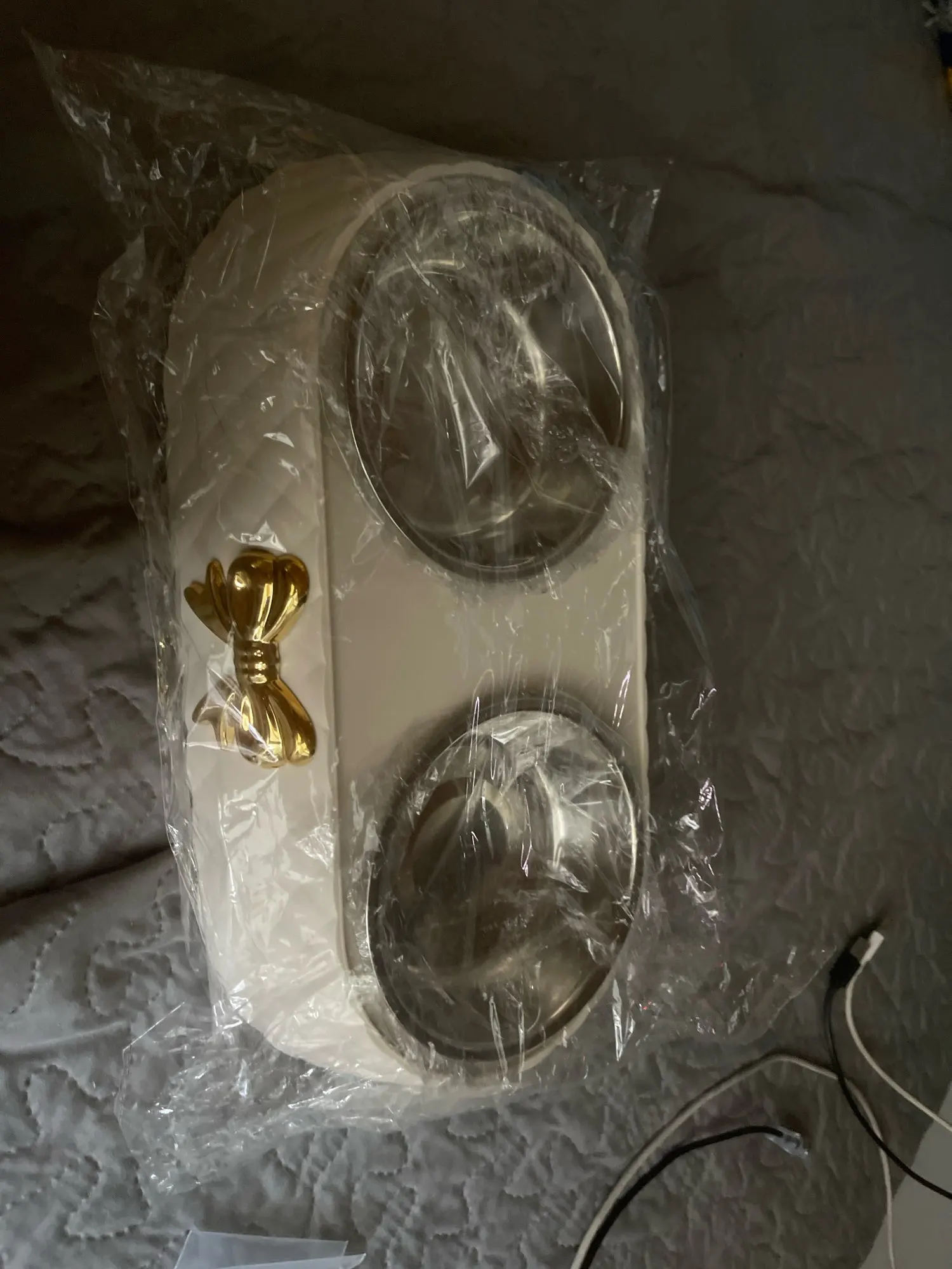 This elegant double bowl set is made for pets with taste. With stainless steel bowls and a quilted base accented by a golden bow, it brings luxury to every meal.